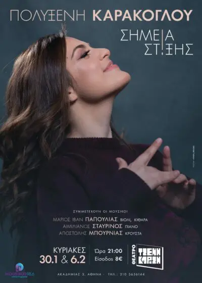 Η Πολυξένη Καράκογλου ανεβαίνει τις Κυριακές 30 Ιανουαρίου και 6 Φεβρουαρίου, στη σκηνή του θεάτρου «Τζένη Καρέζη», στο κέντρο της Αθήνας, και παρουσιάζει τη μουσικοθεατρική παράσταση «Σημεία Στίξης», εμπνευσμένη από το ομότιτλο album που πρόσφατα κυκλοφόρησε. Μια ιστορία με αρχή, μέση αλλά χωρίς τέλος…